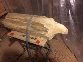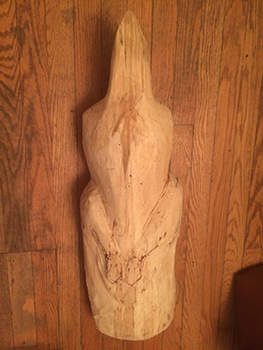 Finally out of the log, shaping the body and underside, smoothing out head, shoulders, belly and roughing in the hind legs and feet.