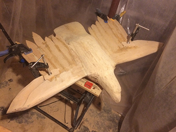 After cutting individual feathers from finely milled basswood, it's time to glue and clamp them to the top.
